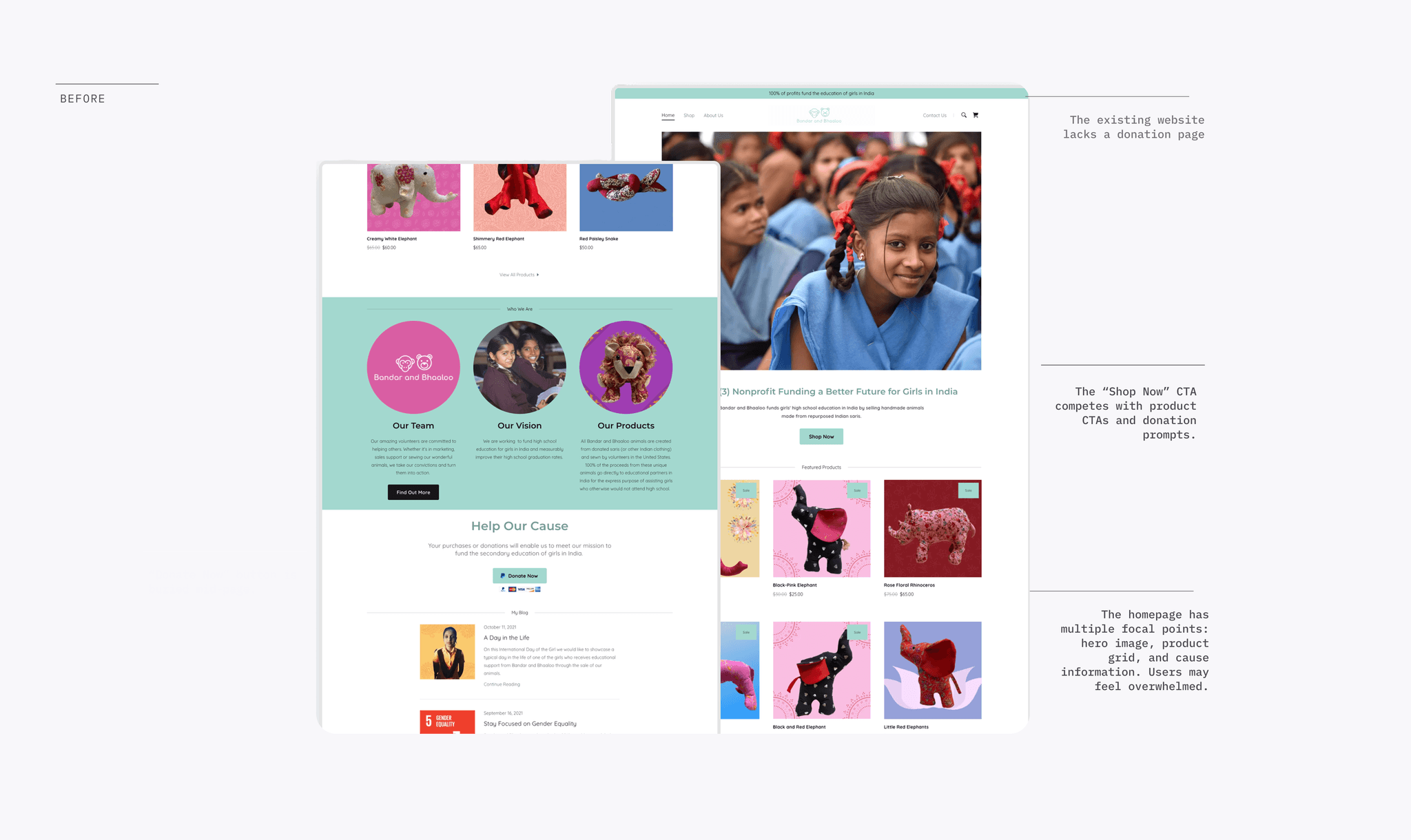 The original homepage tried to accomplish everything simultaneously, mission explanation, product catalog, blog posts, donation appeals, and team information, all stacked on a single long scrolling page. This created information overload, with competing focal points leaving visitors uncertain what action to take or where to focus attention first.