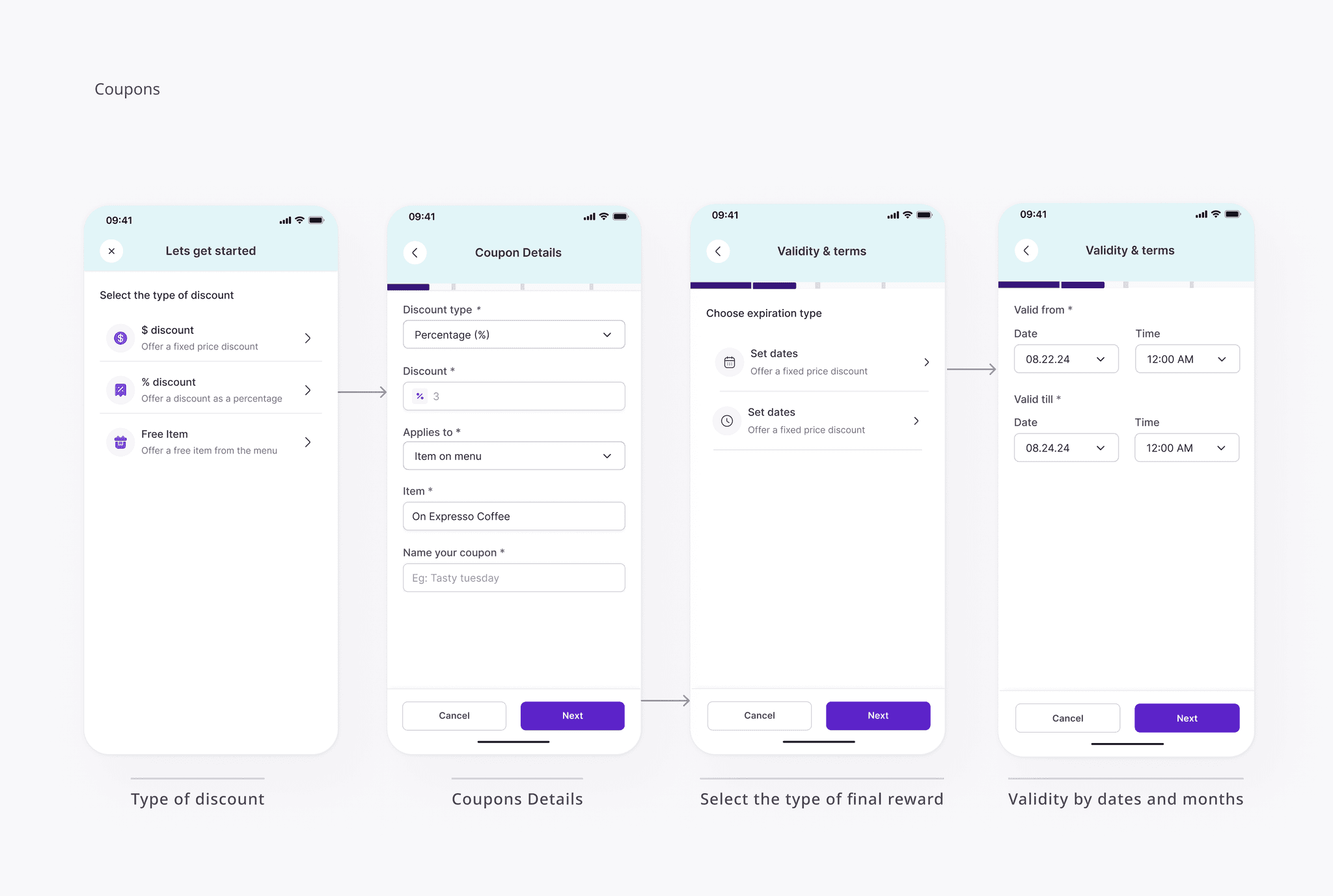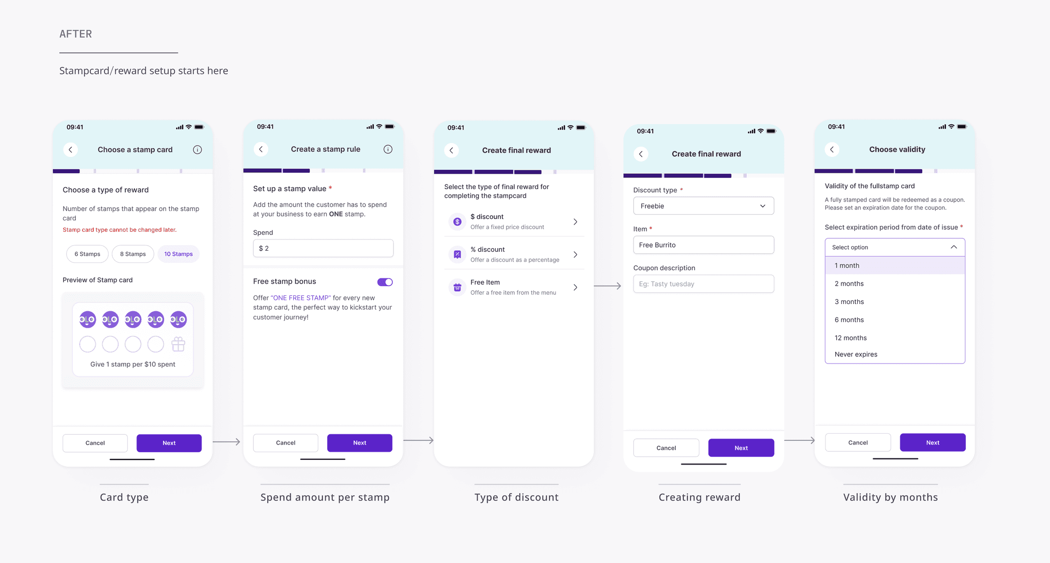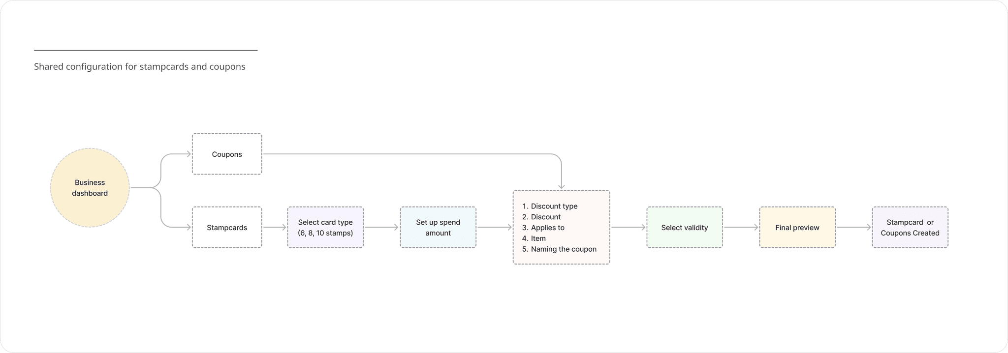 I designed distinct creation flows for stamp cards and coupons to accommodate their different mechanics while maintaining visual and interaction consistency across both.