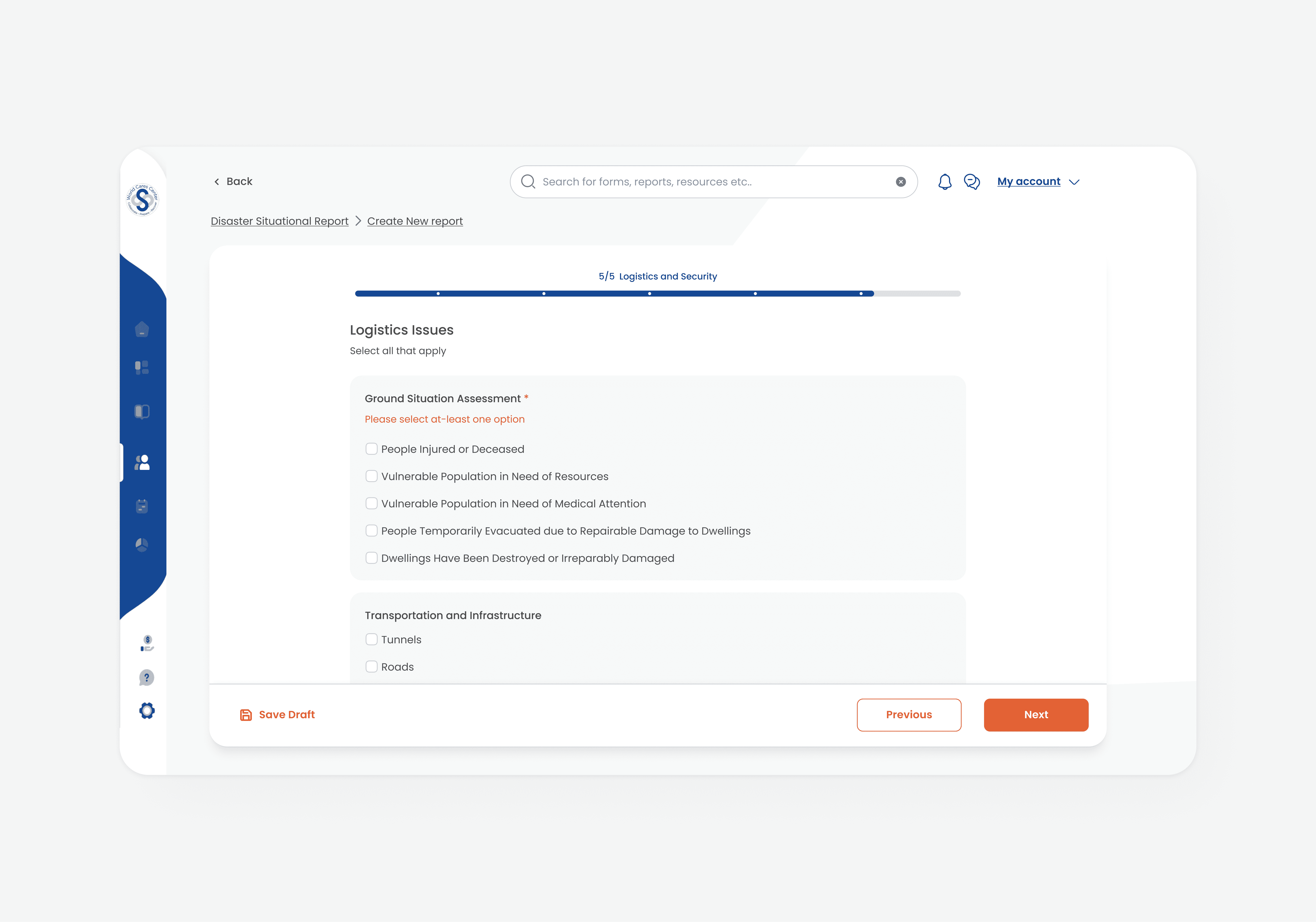 Related fields like Title, Name, and Organization are grouped together to reduce cognitive load. Combined with Save Draft on every screen, volunteers can pause and resume without losing progress which is critical when field connections drop mid-submission.